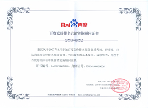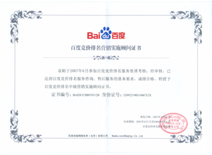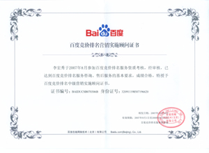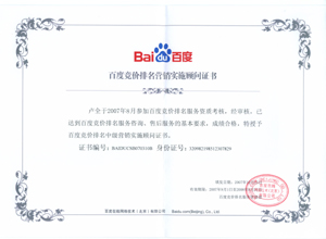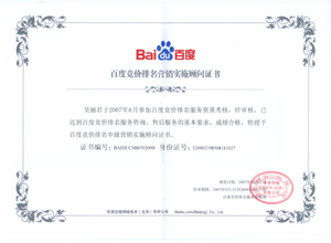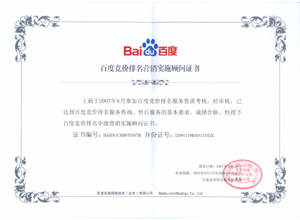 鹽城思科網(wǎng)絡(luò)工程有限公司作為百度鹽城地區(qū)總分銷商,在2007年度參加百度競(jìng)價(jià)排名服務(wù)資質(zhì)考核中,經(jīng)過公司全體員工們的共同努力,再創(chuàng)佳績(jī),其中通過中級(jí)服務(wù)認(rèn)證考核8人,3人優(yōu)秀,通過率達(dá)95%,被全球最大中文搜索引擎——百度在線(北京)有限公司再次授權(quán)百度競(jìng)價(jià)排名鹽城地區(qū)唯一客戶服務(wù)中心。盡善盡美的售后、全心全意的服務(wù),思科人將用十二分的熱忱等待您的惠顧,共創(chuàng)新紀(jì)元!